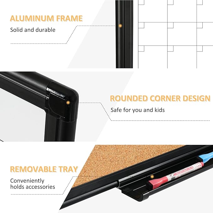 - 【3-in-1 Double-sided Board 】Our board has two sides: one side is a blank whiteboard, the other is a monthly dry erase calendar + corkboard. More writing space allows you to handle more projects - track of bills, events, dates, plans, reminders, tasks or to-do list. The cork board is perfect for photos, notes, messages, or other decors as you like. Versatile use. Great as a gift!