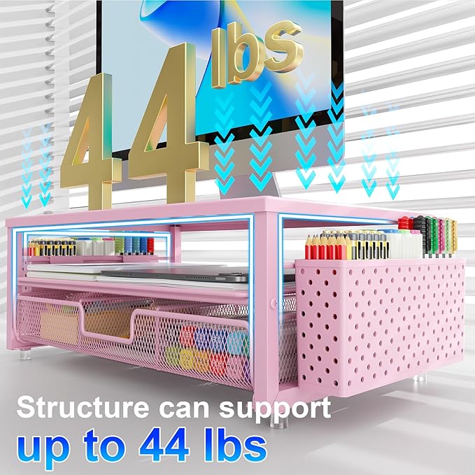 - 【Unique Desk Decor】: The monitor stand has a classic pink coating, adding elegance and modernity to your office while being sturdy and practical. allowing you to work in a cozy and tidy environment with greater comfort and efficiency.