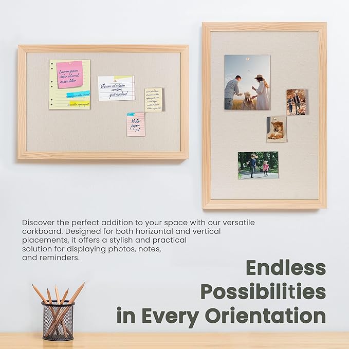 - Premium Solid Wood Frame: Cork board with a solid wood frame measuring 1.38" in width. This sturdy construction ensures durability and longevity, providing a reliable display solution for your photos, notes, and reminders. Its elegant design adds a touch of sophistication to any space, making it a versatile and stylish addition to your home or office decor.