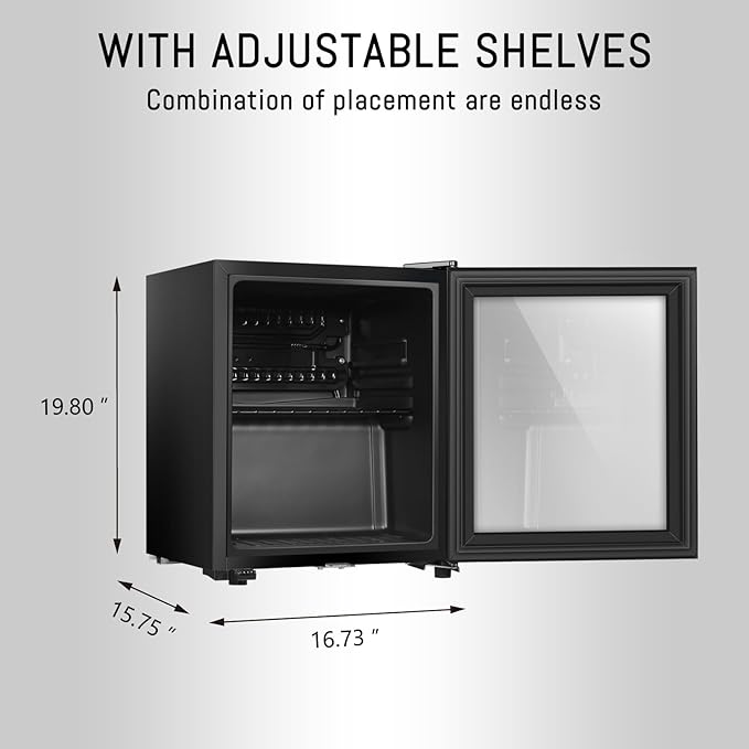 - ADJUSTABLE SHELEVES:You’ll receive a beverage refrigerator with 1 racks; Shelves can be removed at will; Pack it full of cans for a party, or make room for taller sized bottles and cans, or even a week's worth of juice boxes for the family