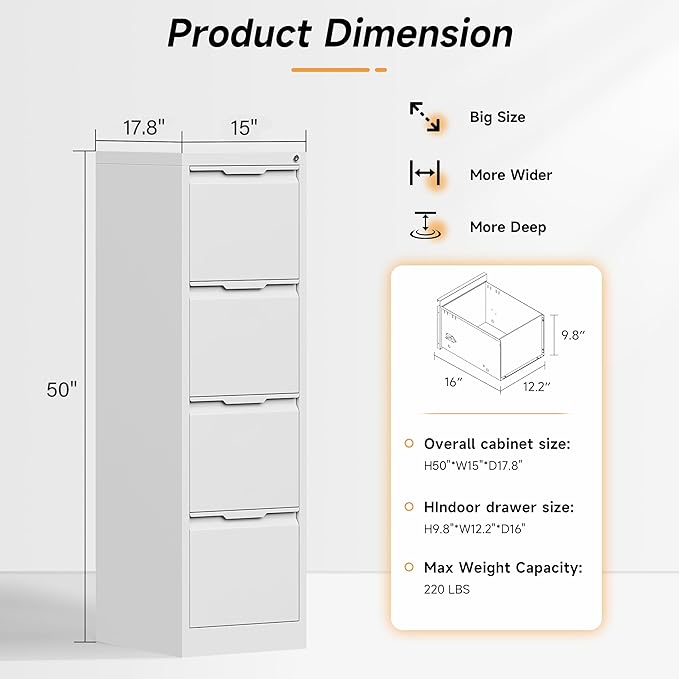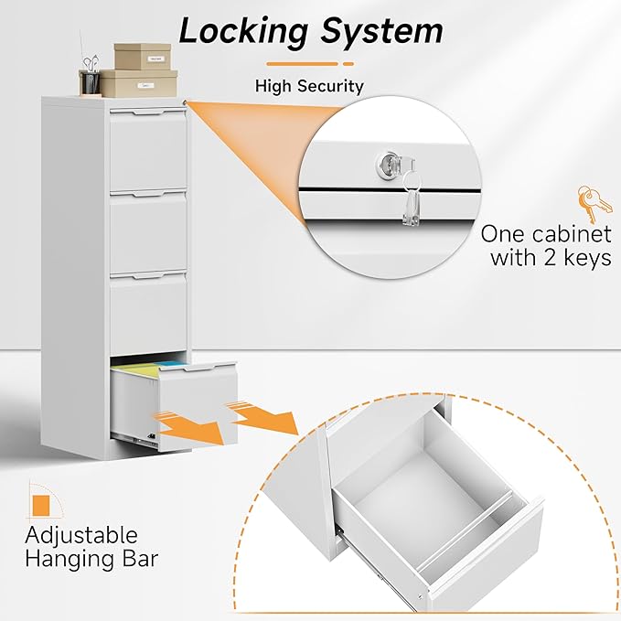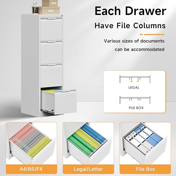 - đ§©ăSUPER FUNCTIONAL VERTICAL FILING CABINETă: Our this file cabinet has four large drawers with 15.7 inches depth, which provides you with large enough storage space. And it is equipped with adjustable hanging rods to store different types of files, such as letter, legal, A4, F4 size folders. It is perfect for you to customize the way you organize your files!