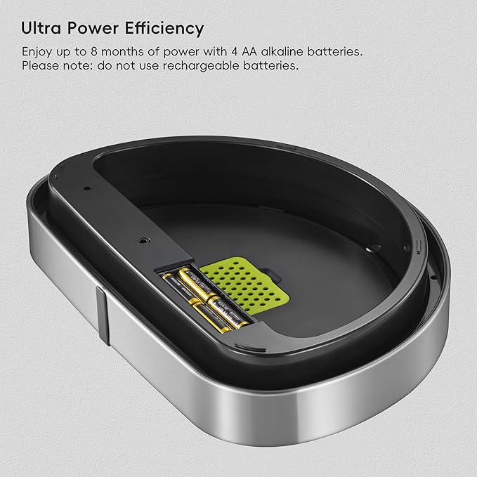 - ULTRA POWER EFFICIENCY - With 4 AA alkaline batteries, enjoy up to 8 months of use, combining eco-friendliness with cost efficiency for your kitchen trash needs. Please note: do not use rechargeable batteries.