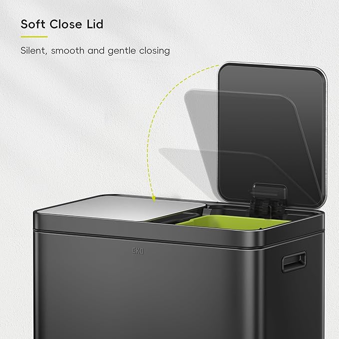 - Dual Pedal Recycler – Effortlessly sort trash and recyclables with two 8-gallon color-coded inner buckets, the EKO dual trash can features separate step pedals and lids for hygienic, no-fuss disposal