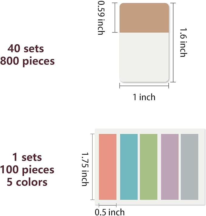- 900 Pieces Tabs: totally 900 pieces 41 sets in total,800 pieces 1 inch adhesive index tabs in 40 sets with 10 different pastle colors,100 pieces 0.5 inch tabs in 1 sets, 20 pieces each color and color as picture displayed