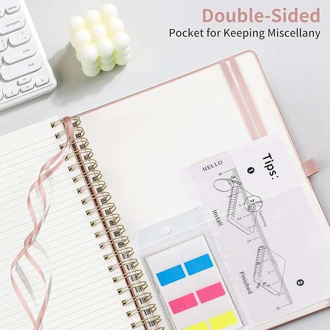 - Lined Journal Additional Features: The lined notebook includes sticky notes, 1 DIY ribbon bookmark, a double-sided PVC back pocket, 1 pen holder, 1 removable ruler, 2 Elastic bands, and a humane rounded arc corner design