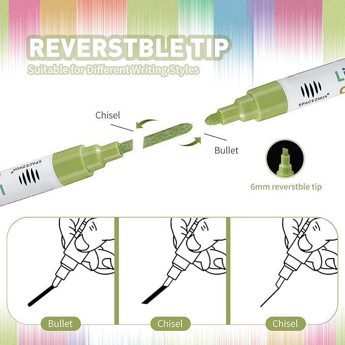 - Reversible Tips for Versatile Use: The 6mm tips on our chalk pens for chalkboard are reversible, offering you the choice of a bullet or chisel tip. Whether you're adding delicate details or making bold statements, the reversible tips make it easy to adapt to your project's needs. Our chalkboard markers work smoothly on chalkboards, glass, metal, and more, allowing you to switch between fine lines and broad strokes for ultimate creative freedom.