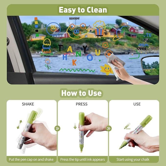 - Easy to Use & Clean: Our liquid chalk markers erasable are designed for effortless application and clean-up. To use, simply put the cap back on, shake the marker thoroughly, press the tip to saturate it with ink, and test it on paper. Chalk markers are designed for easy cleanup on any chalkboard, windows, glass, or other non-porous surfaces. With just a dry or damp cloth, you can erase vibrant designs made with chalk pen, and start fresh.