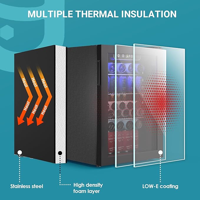 - 【FAST AIR COOLING TECHNOLOGY 】The Beverage Fridge with an energy-saving compressor, the compressor and circulating fan efficiently disperse cold air throughout the drink cooler. Noise can be controlled under 38 dB. The double-layered door efficiently blocks UV rays and the mini fridge's superior sealing ensures a constant internal temperature