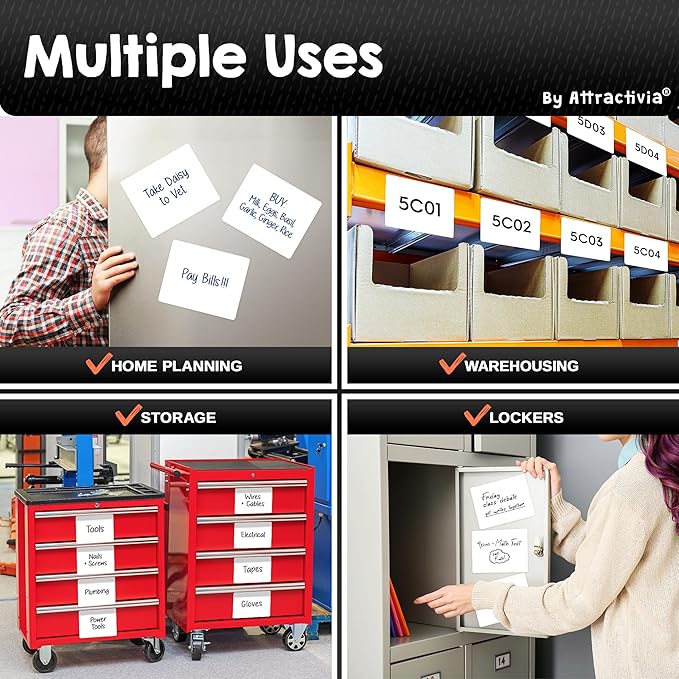 - Premium Quality: Our magnetic labels for whiteboard feature a white, dry erasable front, ensuring smooth writing and easy wiping. No more ghosting, streaks, or dull markings. Every message stays clear and professional with our magnetic labels for shelving. Each label measures 7.3 x 5.6 inches.