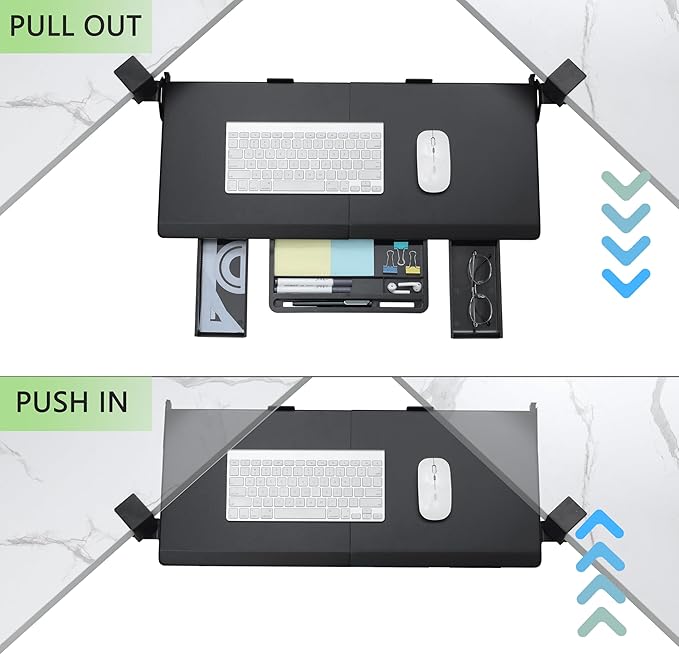- ERGONOMIC KEYBOARD TRAY: It’s essential to have the right posture to protect your wrist, arms, neck, and shoulders when you’re at your desk. An underdesk keyboard tray promotes an optimal typing position. It ensures you sit safely and can protect against neck and shoulder pain, wrist strain, and even RSI