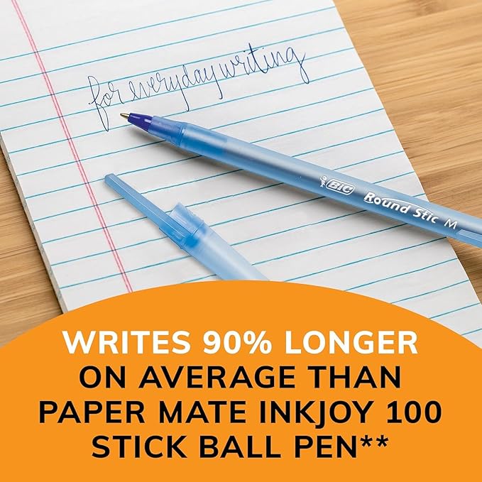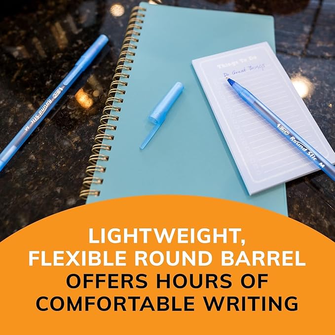 - BIC ROUND STIC BLUE PENS: Enjoy a high-quality writing experience with these classic medium point pens featuring a flexible round barrel for superior comfort.