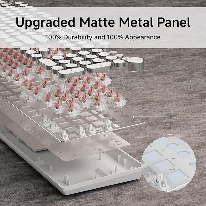 - 【Metal Panel and Electroplated Punk Keycaps】:The typewriter gaming keyboard panel is made of top-grade aluminium alloy, with a metallic matte texture, sturdy and robust enough to protect it from scratch. The floating keycaps are carefully crafted using metal plating technology, with a unique monochromatic light that instantly makes your keyboard look stunning, and enhances the feeling of the wired backlit keyboard.