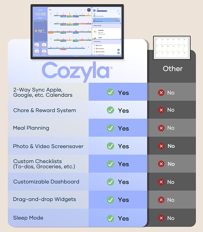 - Simplify Your Life: Make family life easier with our family calendar electronic. It works seamlessly with the Cozyla+ mobile app, so you can manage schedules and update events anytime, anywhere.