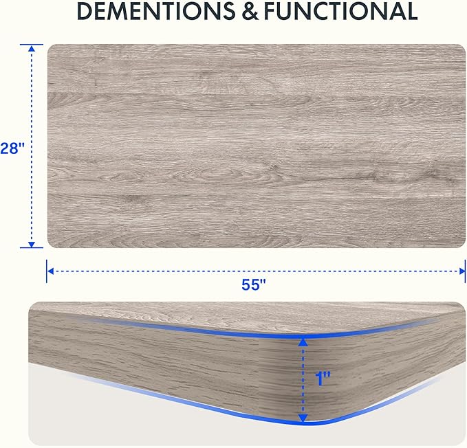 - AMPLE WHOLE-PIECE DESKTOP: With its whole-piece 1β eco-friendly desktop, this standing desk provides plenty of room for your computer setup, documents, and accessories, creating a well-organized and productive work environment. Due to hand measurements, desktop dimensions may vary slightly by 0 to 1β.