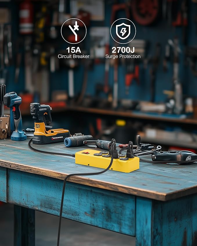 - Durable and Safe: The Metal Surge Protector Power Strip in Yellow boasts a robust, extruded aluminum housing, ensuring it can withstand harsh environments. With 8 outlets and advanced surge protection, this heavy duty power strip surge protector keeps your devices safe and powered in the most demanding settings, making it an ideal workshop or garage power strip.