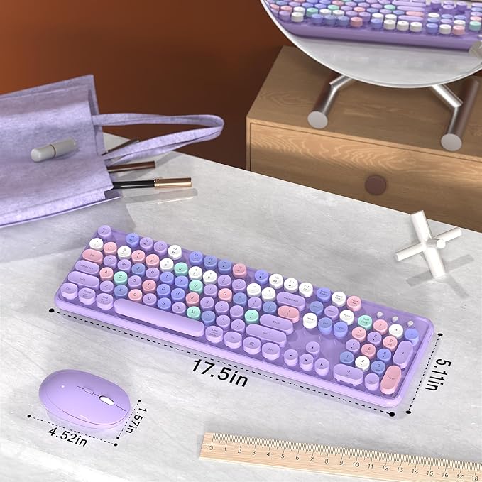 Colorful Wireless Computer Keyboard and Mouse Combo with Round Typewriter Keycaps, Retro Design, Power Switch, Ergonomic Design, 2.4GHz Wireless for Windows, Mac, PC(Purple-Colorful)