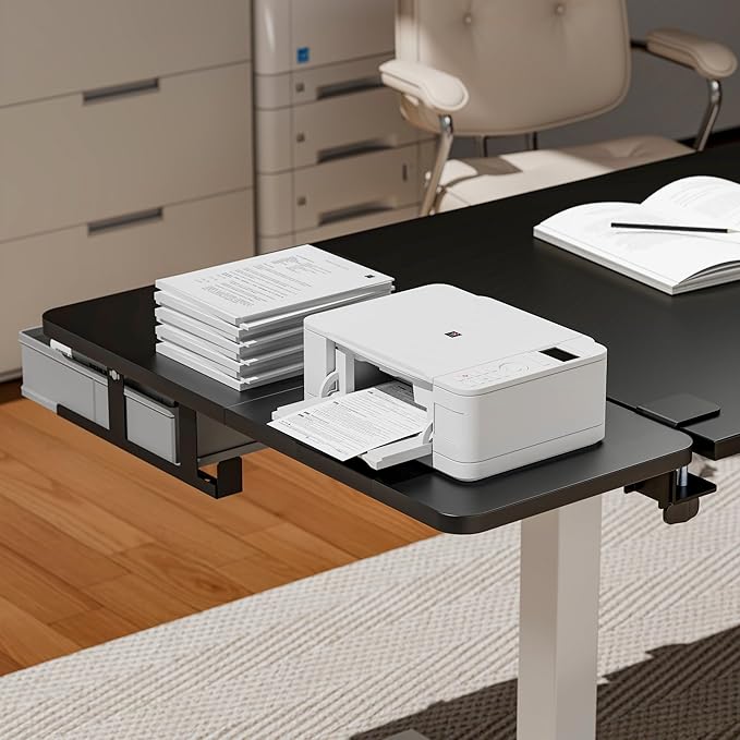 - MULTIFUNCTIONAL USE AND OPTIONS: This desk extension is designed to hold office supplies, laptops, keyboards, mice, printers, and more. It works as a desk armrest, shelf, desk extension, keyboard and mouse tray or equipment stand. Available in three colors (black, white, and walnut) and two sizes (medium and large), it meets various aesthetic and functional needs for different workstation setups.