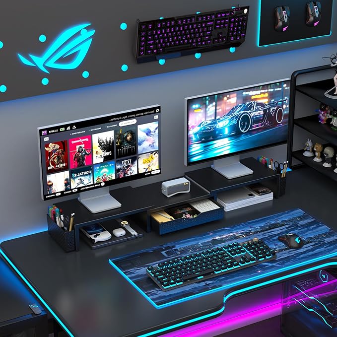- 【Ample Storage Space】The dual monitor stand features two magnetic pen holders and a drawer, allowing you to easily organize your desk accessories and office supplies, keeping your workspace clear and tidy for easier access.