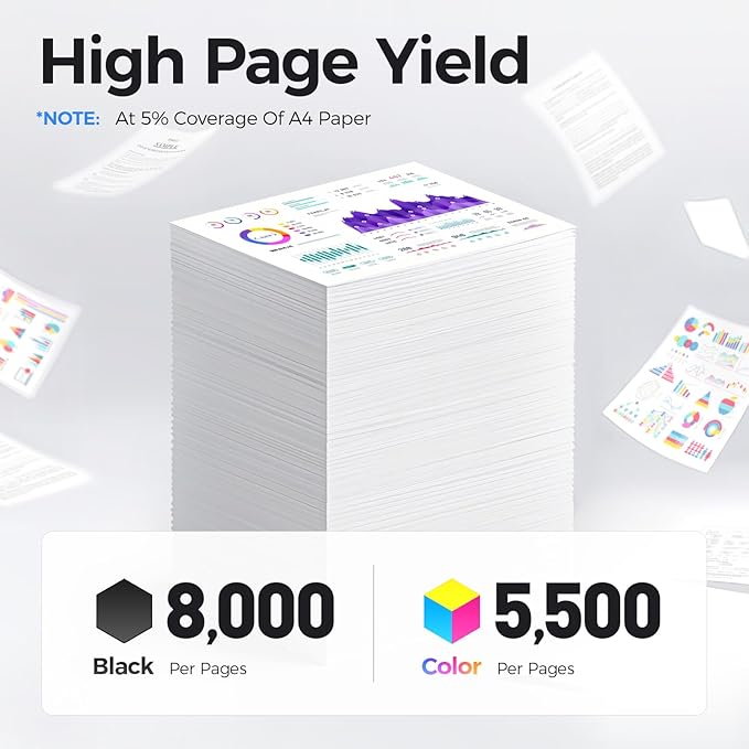 - High-Yield: up to 8,000 pages per C310/C315 Black and 5,500 pages per C310/C315 Color (Total 24,500 pages, 5% coverage).