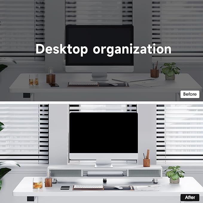 - 【Space Optimization】: Experience effortless desk organization with our monitor stand, 2-tier storage space, 42.5 inches long monitor stand, 3 high capacity compartments, and a convenient sliding drawer, and cable management openings. Streamline your workspace and make your work a breeze