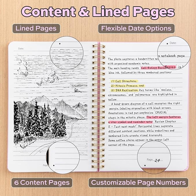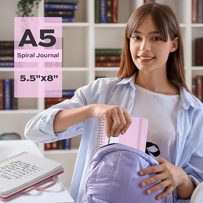 - Expandable Inner Pocket & Elastic Band: Lined Spiral Journal Notebook is equipped with an expandable inner pocket on the back cover for storing sticky notes and note cards, making it easy to organize study materials and record inspiration anytime. Featuring an elastic closure band, it closes easily and quickly to prevent damage to the inner pages, offering a more convenient user experience and long-lasting protection.
