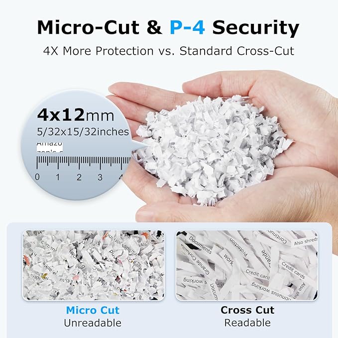 - High Security P-4 Level: Micro-cut turns paper into tiny pieces measuring 5/32" x 15/32" (4 x 12 mm), greatly protecting your privacy.