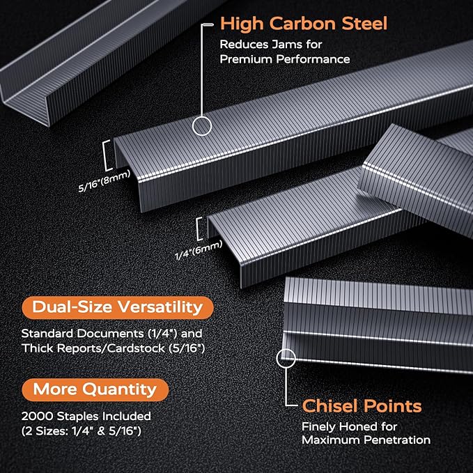 - 【Easy to Use & Comfort:】 Easy to use as a touch stapling stapler on the desktop or a handheld stapler on the go! Spring-loaded, anti-slip grip reduces hand strain during marathon stapling sessions. Suitable staple types: staples with 1/4" long leg for 25 sheets: #23/6, #24/6, #26/6(standard staples) and staples with 5/16" long leg for 50 sheets: #23/8.