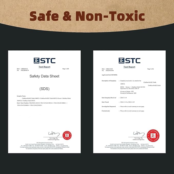 - Safe & Non-Toxic: At Chalkaa, we prioritize the health of our users. Our chalk is non-toxic, passes safety certifications, and meets various standards, making it suitable for all age groups. Whether you're a teacher giving a long lecture or a child engaging in creative art projects, our chalk is safe and healthy to use.
