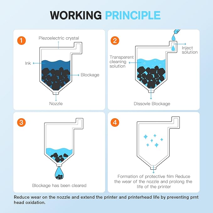 - 【Excellent Cleaning Ability】 Repair unclog cleaning kit contains enzymes, which can strongly dissolve and clean dry ink, wet and protect the print head. The degradation factor can strongly dissolve the hard block and other soluble impurities left after the ink hardens, making the ink flow more smoothly, protect your printhead and extend your printer life.