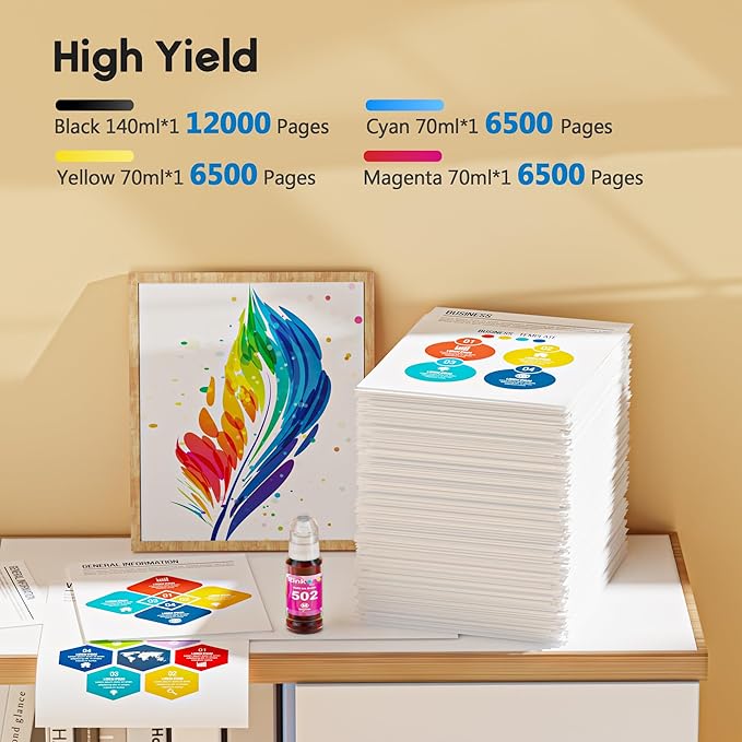 - Extra-Large Capacity ink bottle with high page yield: 72 bottles of 140ml black dye ink can print up to 17000 pages, 6000 pages per 70ml color dye ink bottle (based at 5% coverage)