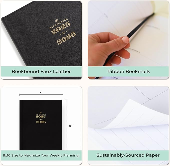Blue Sky Day Designer 2025-2026 Academic Year Weekly and Monthly Planner Calendar, July 2025 - June 2026, 12-Month, 8" x 10", Faux Leather Cover, Bookbound, Black