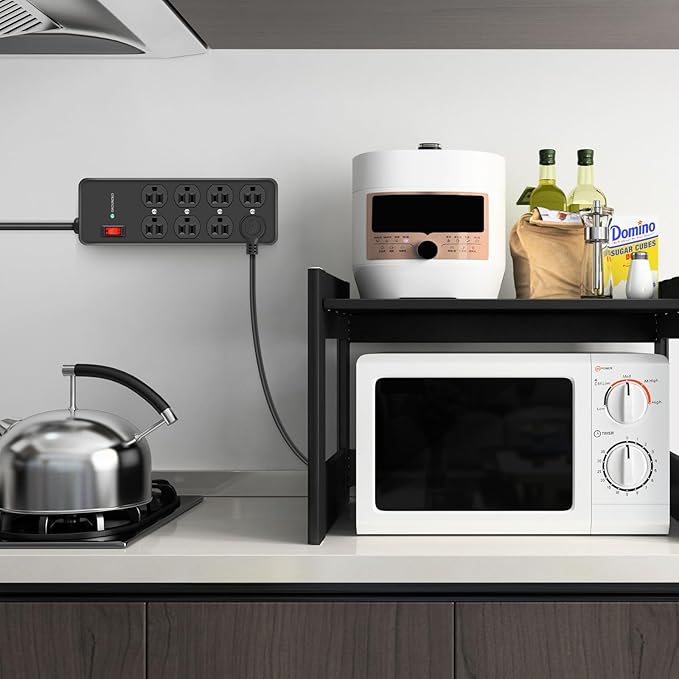 - Security Protection:This power strip features a built-in 2700J surge protector and 15A circuit breaker overload protection, short circuit protection, overcurrent protection, overvoltage protection, and overheat protection. The surge protector with overload protection protects your appliances from lightning, surges, or spikes, and when the voltage surge is overwhelming, it automatically cuts off the power to protect connected equipment.