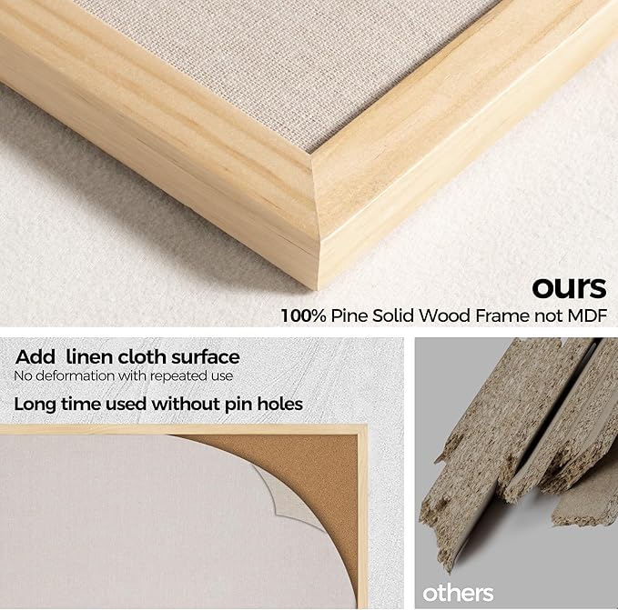 - Pine Frame Material: Our cork boards for walls is made of 100% pine wood which has well self-healing ability and repairability. The pin board features a four-ply splint design that is strong and thick enough not to be punctured by thumbtacks.