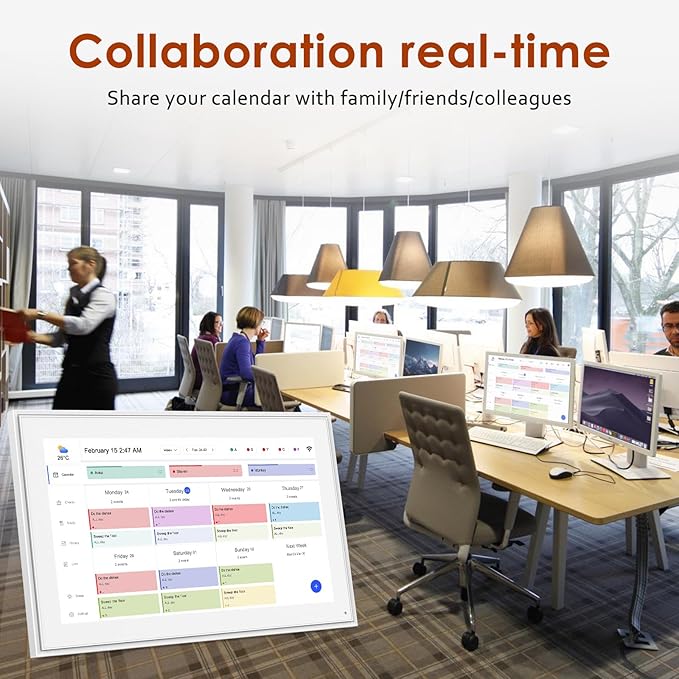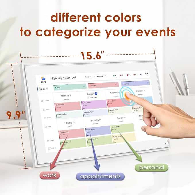 - ✍User-Friendly Interface: Our Digital Calendar boasts a clean and intuitive design, with 15.6" FHD touchscreen. making it easy for anyone to navigate and use, managing your time has never been simpler. Use different colors to categorize your events (work, personal, appointments), so you can quickly identify what’s on your agenda at a glance. Installation method can choose wall mount or Standing on the table.
