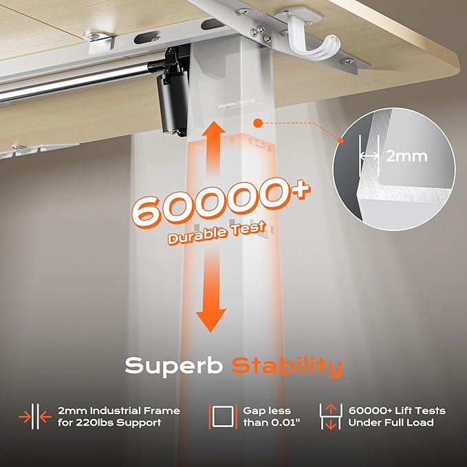 - 【Built to Last with Exceptional Stability】The industrial-grade steel frame and T-shaped design of the stand up desk support up to 220 lbs, ensuring stability and reliability for years to come. Paired with a durable motor, this home office desk is designed to meet the demands of your dynamic workday