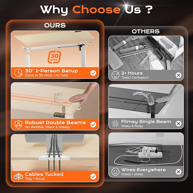 - 【Whisper-Quiet Operation】Powered by a robust yet quiet motor (operating at less than 45 DB), the wide deep desk brings smooth height adjustments without disturbing your household or office environment. This standup desk for home office is ideal for keeping focus and slient