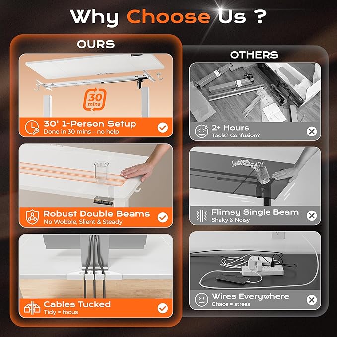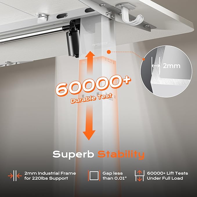 - 【Built to Last with Exceptional Stability】The industrial-grade steel frame and T-shaped design of the stand up desk support up to 220 lbs, ensuring stability and reliability for years to come. Paired with a durable motor, this home office desk is designed to meet the demands of your dynamic workday