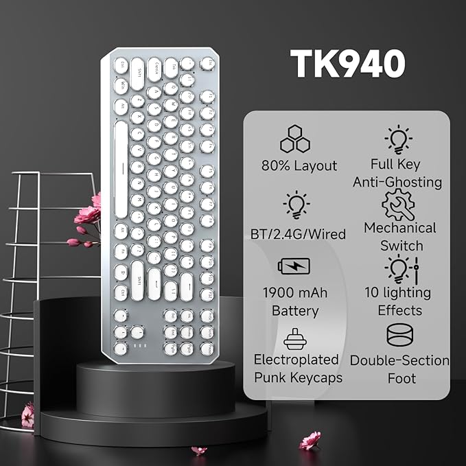 EWEADN Wireless Mechanical Typewriter Keyboard,80% Layout with White Backlit, Anti-Ghosting, Blue Switch Bluetooth/2.4GHz/USB-C Aesthetic Keyboard-White