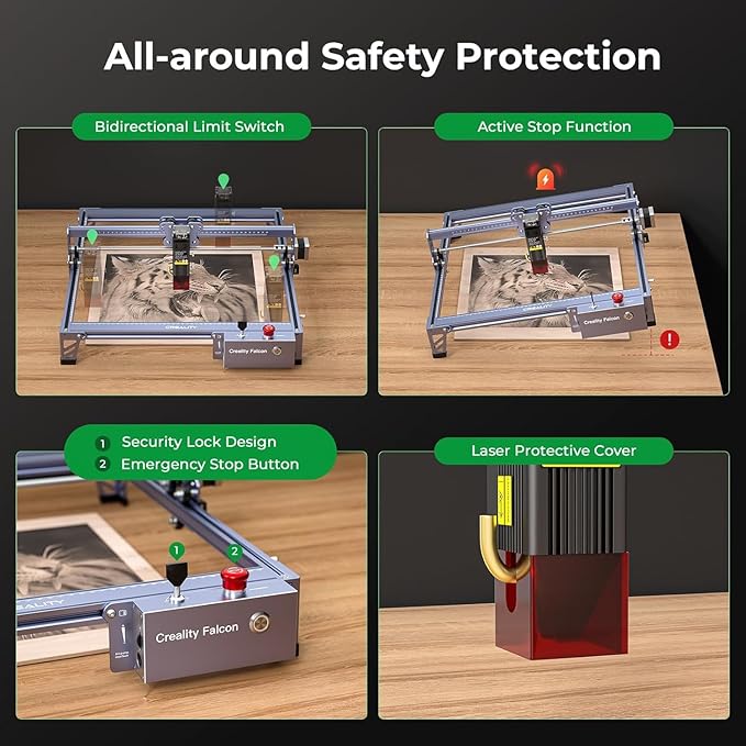 - 【Safe and Easy to Assemble】 The laser engraver machine can be assembled in 10-20 minutes. Has anti-UV filter acrylic on the module for eyes protection, feature with emergency stop button and active stop function for accidental tilt, flip or drop, with the buzzer and indicator sending alert.