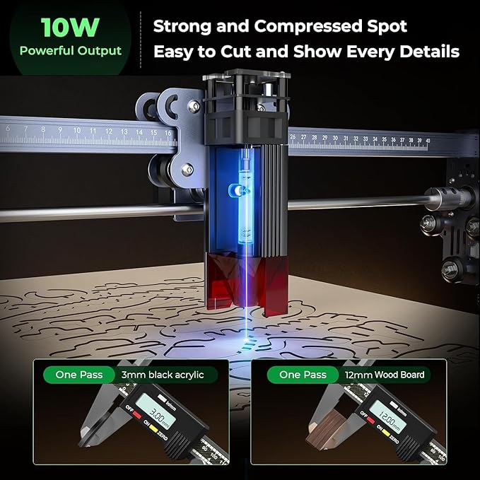 - 【Work Higher Productivity】 The laser engraver provides 10000mW output power and laser class 4, which can cut a 12 mm wood board or 3mm black acrylic in one pass at a speed up to 10000mm/min. Easy to engrave on a wide variety of materials, including cutting paper, plastic, acrylic, urethane foam, and most consumables such as metal, glass etc.