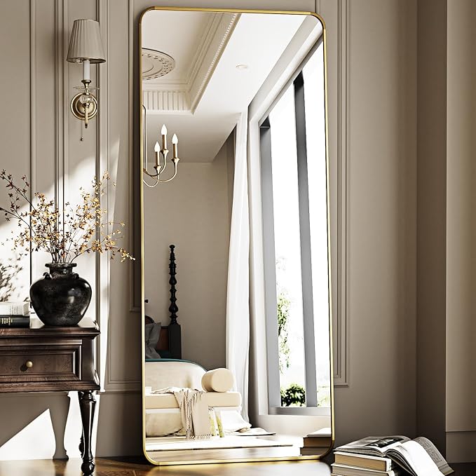 - Aluminum Alloy Frame - Elevate your decor with the elegant aluminum alloy frame of our gold full length mirror. The classic design, measuring 0.55 inches wide, adds a touch of sophistication. The rounded frame not only enhances aesthetics but also ensures safety in use