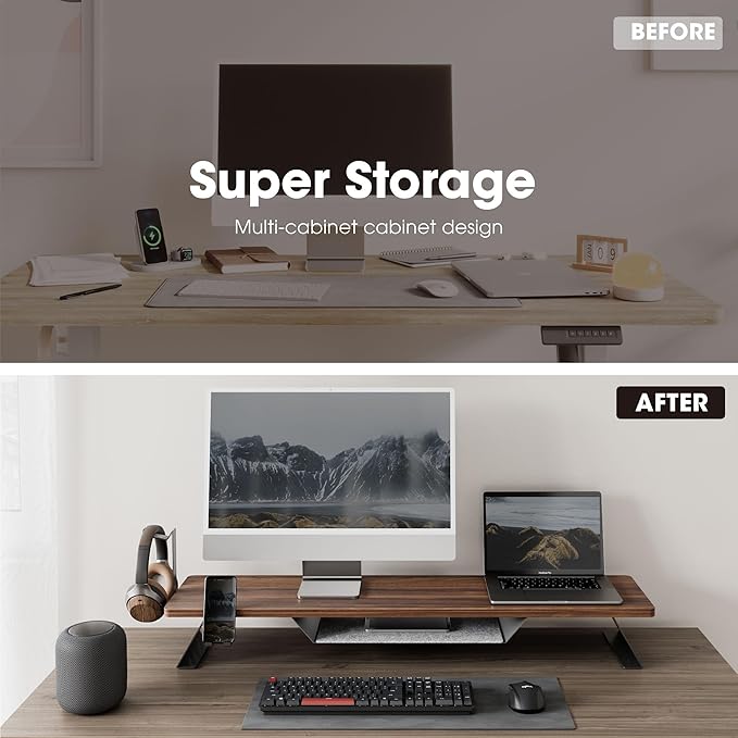 - 【Ergonomic & Adjustable】Monitor shelf raises your monitor or laptop by 5.4 inches to the perfect eye level, reducing neck and shoulder strain. Pre-drilled holes computer stand let you position headphone stand and phone holder left or right according to your habits, balancing efficiency and health.
