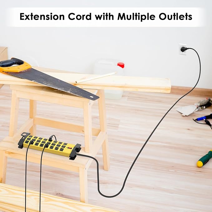 - 6Ft Cord & Metal Housing - Crafted with a 14 AWG ETL Certified cord, this power strip offers both durability and extended reach. The metal housing ensures enhanced safety and longevity, making it ideal for garages, workshops, and more