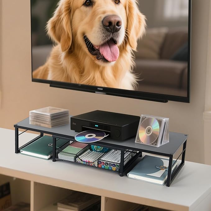 - More Storage Space: Space under the monitor stand can be used for additional desk supplies storage. A drawer tray can compartments size for different stationery. The desk monitor stand creating a clear workspace environment