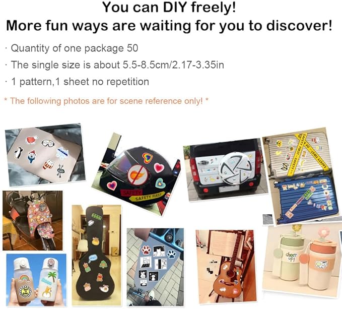 - 【50 Waterproof Stickers】:These are large-sized stickers, with each sticker being approximately 10cm in size (irregular shape). They are suitable for use on luggage, laptops, bicycles, motorcycles, stationery, scooters, furniture, refrigerators, mobile phones, water cups, helmets, cars, and anywhere else to show off your taste and personality and add more color to your life.