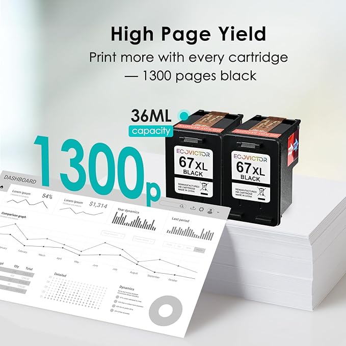 - Long-Lasting Page Yield: EcoVictor 67xl black ink cartridge for hp 67 black ink cartridge prints up to 650 pages each (at 5% coverage). EcoVictor for hp 67 ink cartridges black is perfect for home, school, or office use. Enjoy long-lasting printing performance without the hassle of frequent replacements.
