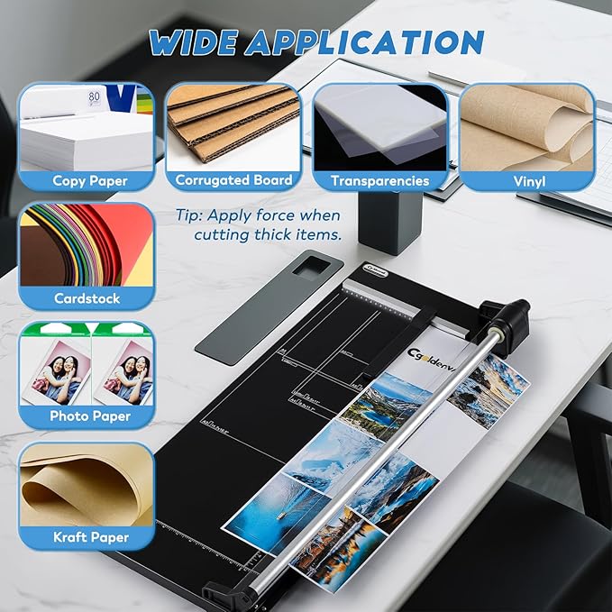 - 24.8" FOR VERSATILE USE: Tackle projects of any scale with 24.8" cutting length, compatible with A3, A4, 5×7" and custom paper sizes. Effortlessly handle copy paper, cardstock, photo paper, cardboard, and thin films, etc.—perfect for offices, home DIY crafts, schools, and photo studios.