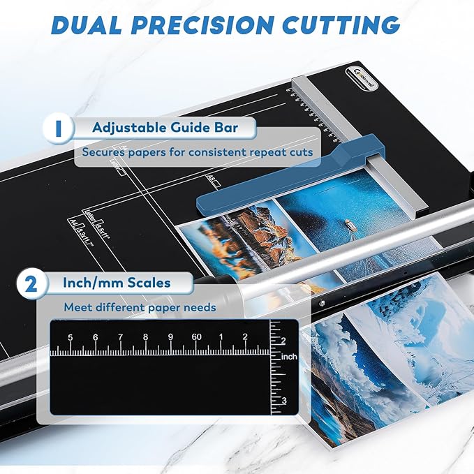 - DUAL PRECISION CUTTING: Laser-etched dual-scale (inch/mm) grid base + adjustable paper guide ensure perfect alignment for repeatable cuts—ideal for crafting multi-page documents, scrapbooking, or framing prints.