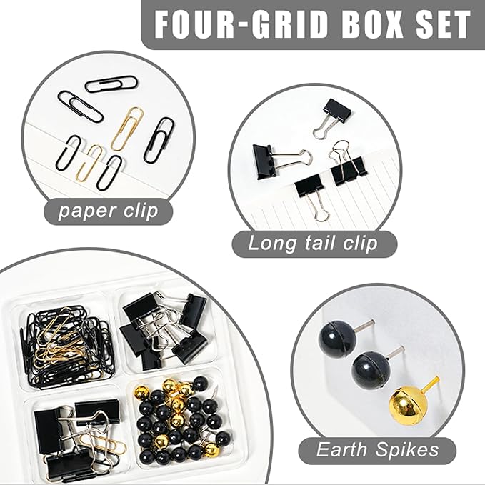 - COMPLETE SET: 10pcs office supplies, All-in-one includes 1 desk organizer for desk, 1 tape dispenser,1 tape, 1 stapler, 1 staple remover, 1 four-grid Clips Set (including 40 paper clips, 3 large binder clips, 5 small binder binders, 25 thumbtacks), 1000 staples, 1 ruler, 1 scissors and 1 pen for instant workspace setup
