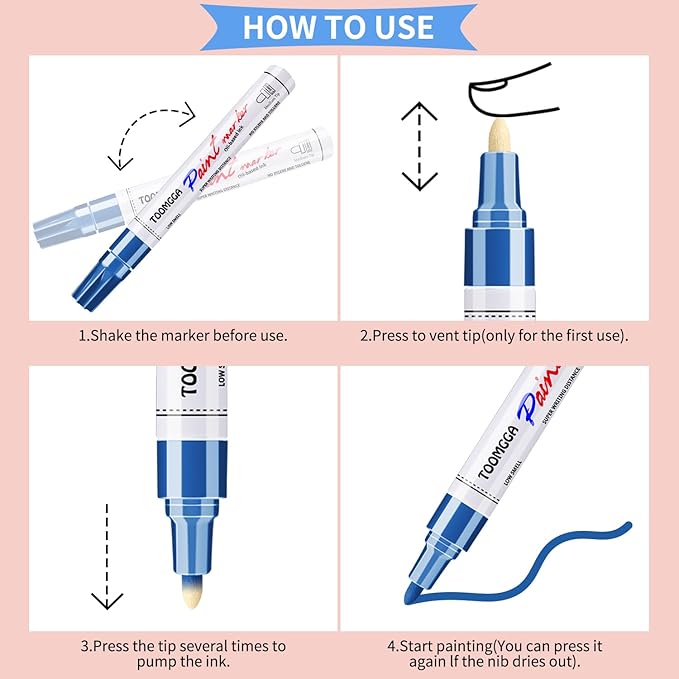 - Premium Quality: Each Blue paint pens paint markers is independently tested, selected, and packaged in individual heat shrink film. Before use: Face tip upright,push against finger. Re-cap and shake. Press tip on surface several times